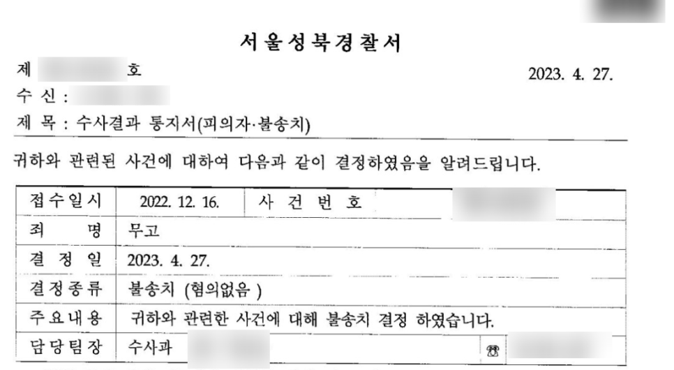 경찰은 저희의 의견서까지 받아보시고, 곧바로 불송치결정을 하였습니다. 의뢰인분께서도 무고죄 고소를 당하고 상대방들이 너무나도 괘씸하고 다소 불안하기도 했지만, 불송치 결정을 받아보시고는 안심하셨습니다.