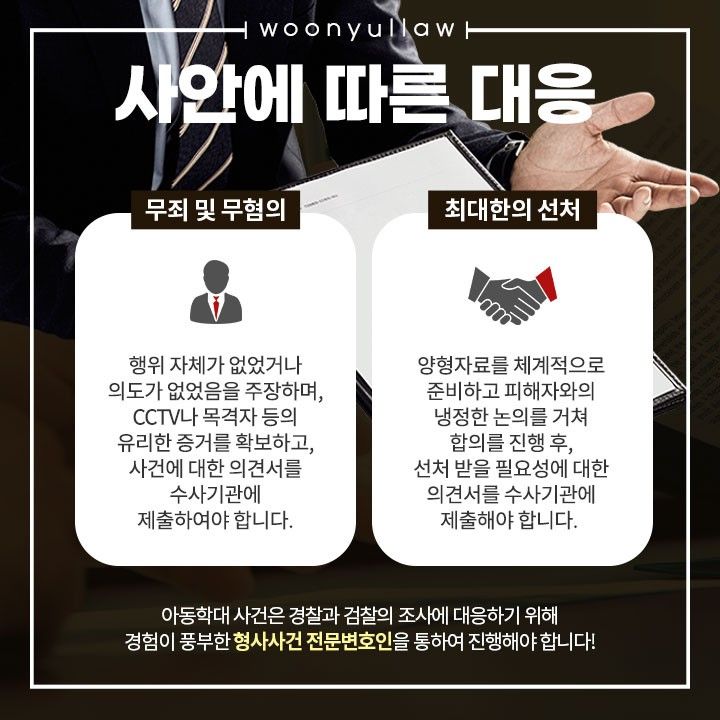 아이가 다쳤는데도 방임을 했다고 해서 내가 아동학대 가해자가 되어 있다니 심지어 방임을 하지도 않았고 몰랐을 뿐인데 소송을 당하게 되는 경우도 있습니다. 때문에 정확히 설명할 수 있는 방향을 찾는 것이 중요합니다.