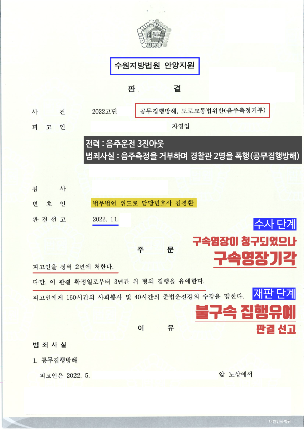 구속영장실질심사부터 철저하게 사건을 조력한 결과, 재판부는 죄질이 매우 안좋은 공무집행방해죄 그리고 처벌 수위가 높은 음주측정거부죄가 경합된 사안인 만큼 무거운 형량을 선고할 사건이지만, 김경환 대표변호사의 변론을 참작하여 선처하겠다며 집행유예 선고로 불구속 하였습니다.