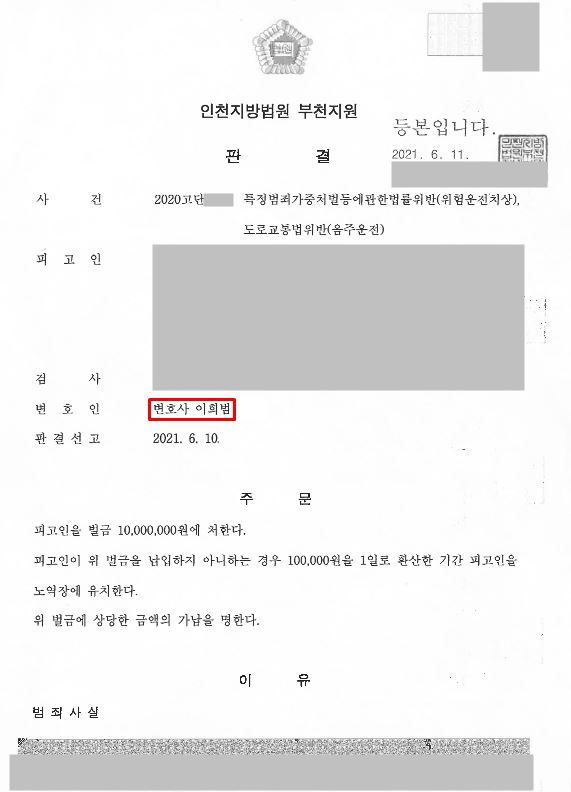 [ 형사 성공사례 ] 위험운전치상(음주운전) 벌금형