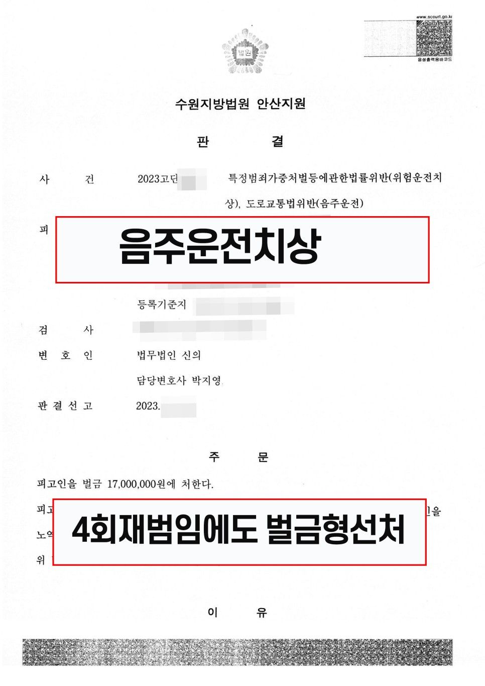 위와 같은 내용으로 재판부를 설득한 결과, 음주운전치상으로 징역형이 거의 확실히되는 쉽지 않는 상황임임에도 불구하고 <벌금>으로 선처를 받아낼 수 있었는데요.
