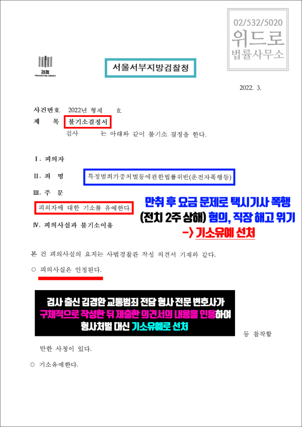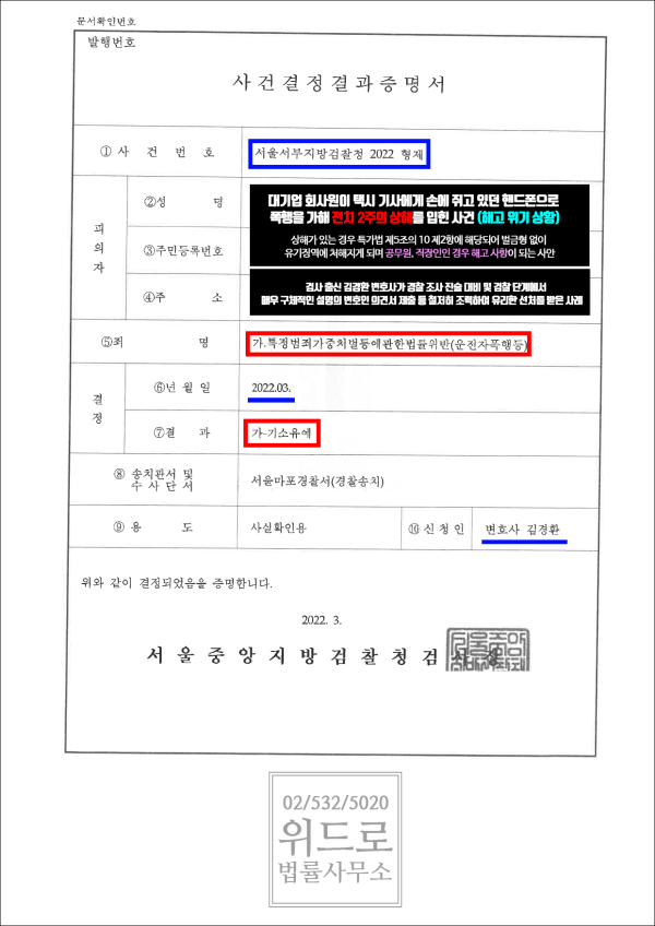 초기에는 경찰, 검찰 모두 본 사건에 대해서 부정적인 견해가 많았었습니다. 그러나 위드로의 대표 변호인의 적극적인 대응, 구체적으로 작성된 의견서와 여러 증거 및 양형 자료들을 확인하면서 분위기 흐름이 바뀌기 시작했고 결국 검찰은 모든 사정을 참작하여 벌금형을 결정하였으며 이후 법원의 약식명령을 통해서 벌금형을 선고받게 되었습니다.