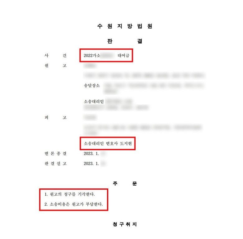 그 결과 법원은 법률사무소 로진의 주장을 모두 인정하여 원고의 대여금 청구를 전부 기각하는 전부 승소판결을 하였습니다. 의뢰인은 바라던 대로 ‘원고의 청구를 기각하고 소송비용은 원고가 부담한다.’라는 내용의 판결을 받을 수 있었습니다. 원고와 피고의 주장이 첨예하게 대립되는 상황이라면 사건초기 법률전문가인 변호사의 조력을 받으시기를 권해드립니다.
