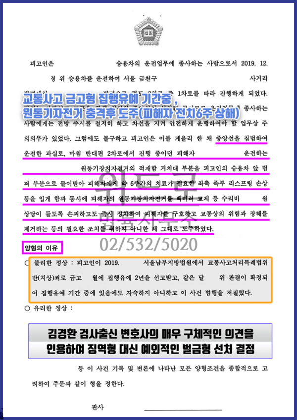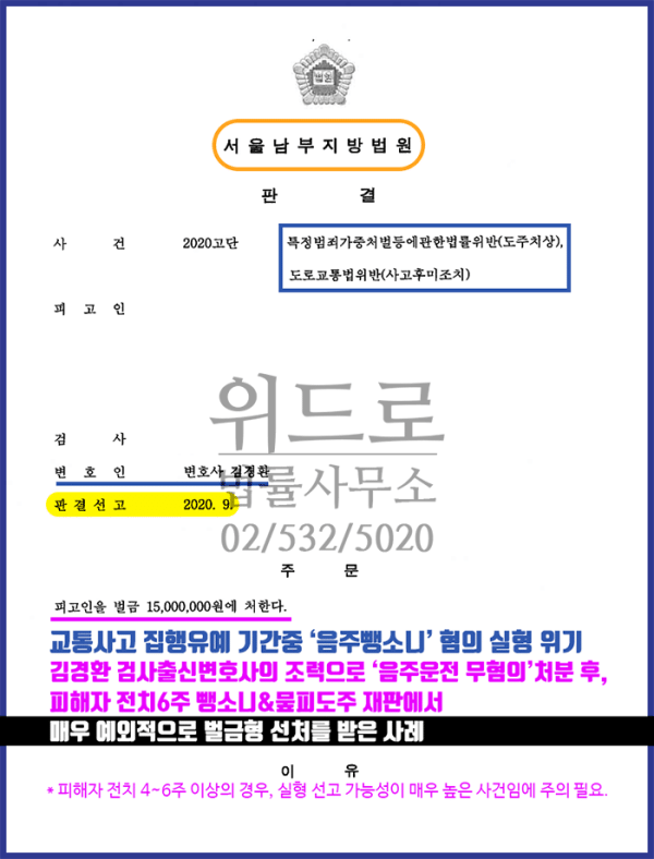 최초 음주 뺑소니 혐의로 입건 되었으나 김경환 교통 범죄 전담 검사 출신 변호인의 조력으로 음주운전은 무혐의 처분, 이후 뺑소니 부분만 재판을 받았는데, 의뢰인이 교통사고로 집행유예 기간 중에 이번 사안의 재범을 한 만큼 실형 가능성이 매우 컸으나 판사님이 변호인의 구체적인 의견을 참작하여 벌금형의 매우 유리한 선처로 마무리.