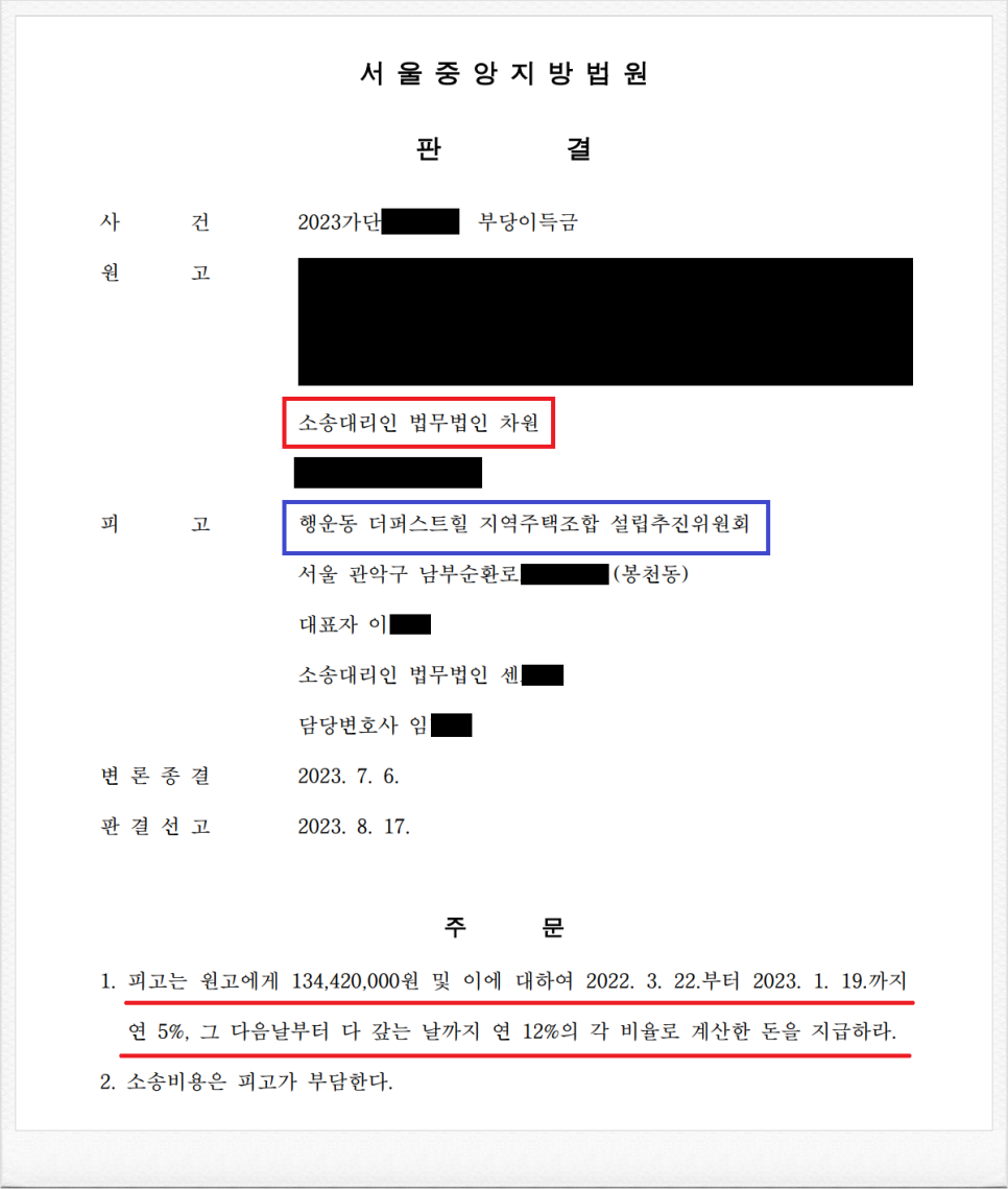 그러나, 가입 후 행운동 더퍼스트힐 지역주택조합 설립추진위원회의 사업이 계획대로 진행되지 않자, 의뢰인은 정식 민사소송을 통하여 조합과 체결한 계약을 취소한 후 기 납입한 금원의 반환을 원하셨습니다.