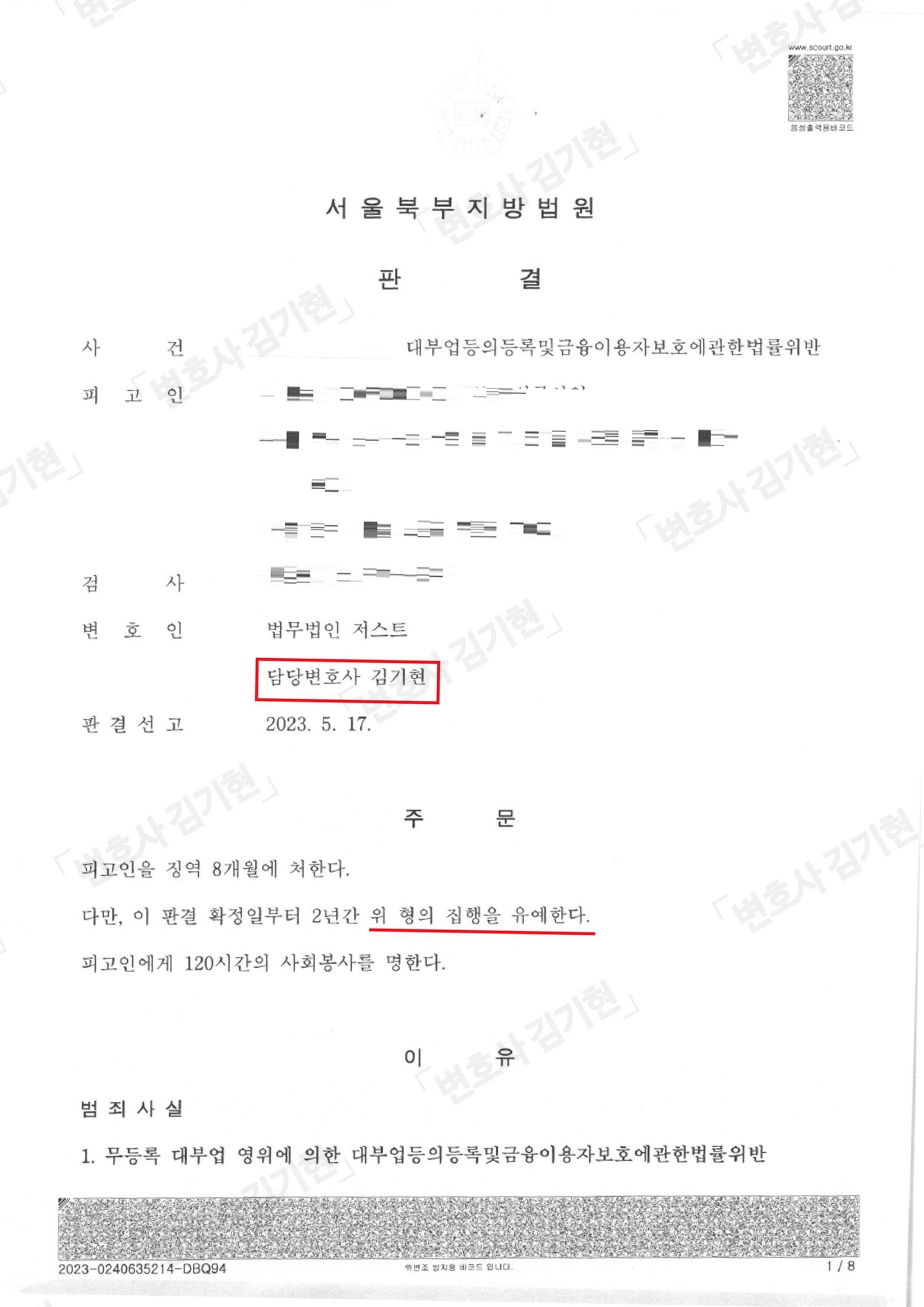 위 의뢰인님과 인연이 되어, 이후 많은 분들을 소개받게 되었고 현재까지도 '대부업등의 등록 및 금융이용자 보호에 관한 법률 위반'사건, 줄여서 '대부업법' 위반 사건을 많이 맡고 있습니다.