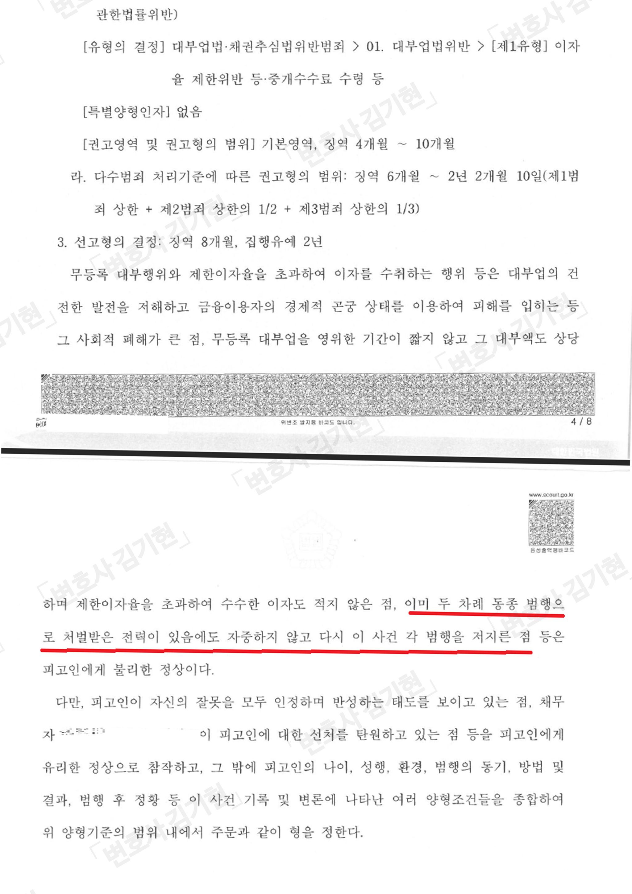 특징적인 것은 의뢰인이 이미 대부업법 위반으로만 두차례 처벌을 받으신 이력이 있었고 이 외의 다수의 전과가 존재하여서 징역형 처벌이 강력하게 예상되는 케이스였습니다.