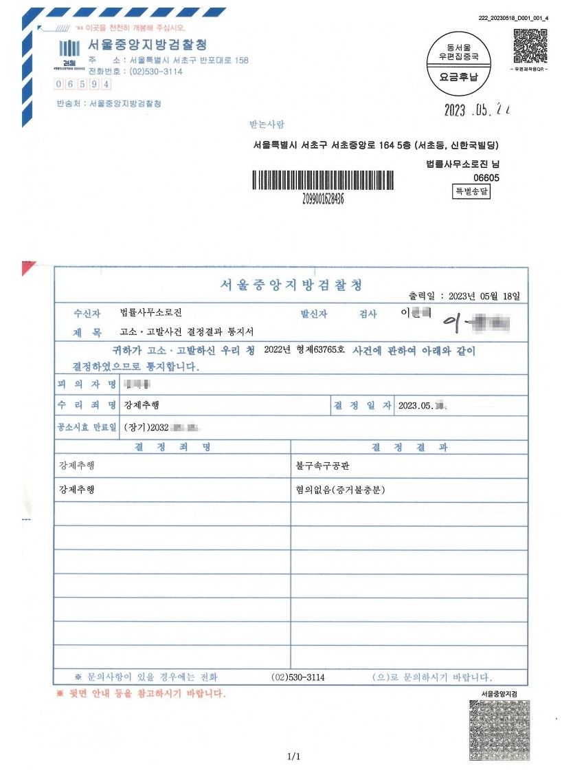 결국, 담당검사는 로진이 제출한 이의신청서 및 고소대리인 의견서에 따라 추가조사를 진행하였고, 결국 가해자의 혐의를 인정하여 재판으로 기소하였습니다. 물론, 경찰 수사관님들은 수사전문가이지만, 간혹 중요 증인을 놓치는 등 수사가 제대로 이뤄지지 않는 경우가 있습니다. 따라서 은밀하게 이뤄지는 기습강제추행의 경우, 법률전문가인 변호사의 도움을 얻으셔서, 억울한 일을 겪지 않도록 주의하시기 바랍니다. 감사합니다.