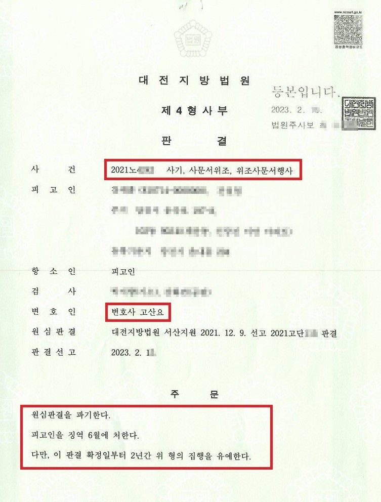 결국, 항소심 재판부는 로진이 작성한 변호인의견서를 바탕으로 원심 판결을 파기하고 의뢰인에게 집행유예의 선처를 해주었습니다. 사기로 인해 재판을 받게 될 경우, 절대 홀로 재판을 수행하지 마시고, 법률전문가인 변호사의 도움을 반드시 받으시길 권해드립니다.
