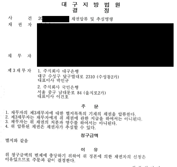 위와 같이 법원으로부터 압류추심결정을 받았다면 한 고비 넘으신겁니다. 그러면 이를 기초로 해당 은행에 추심금 지급요청을 하시면 되는데요, 은행마다 추심신청 방법이 다르니 미리 확인하시는게 좋습니다.