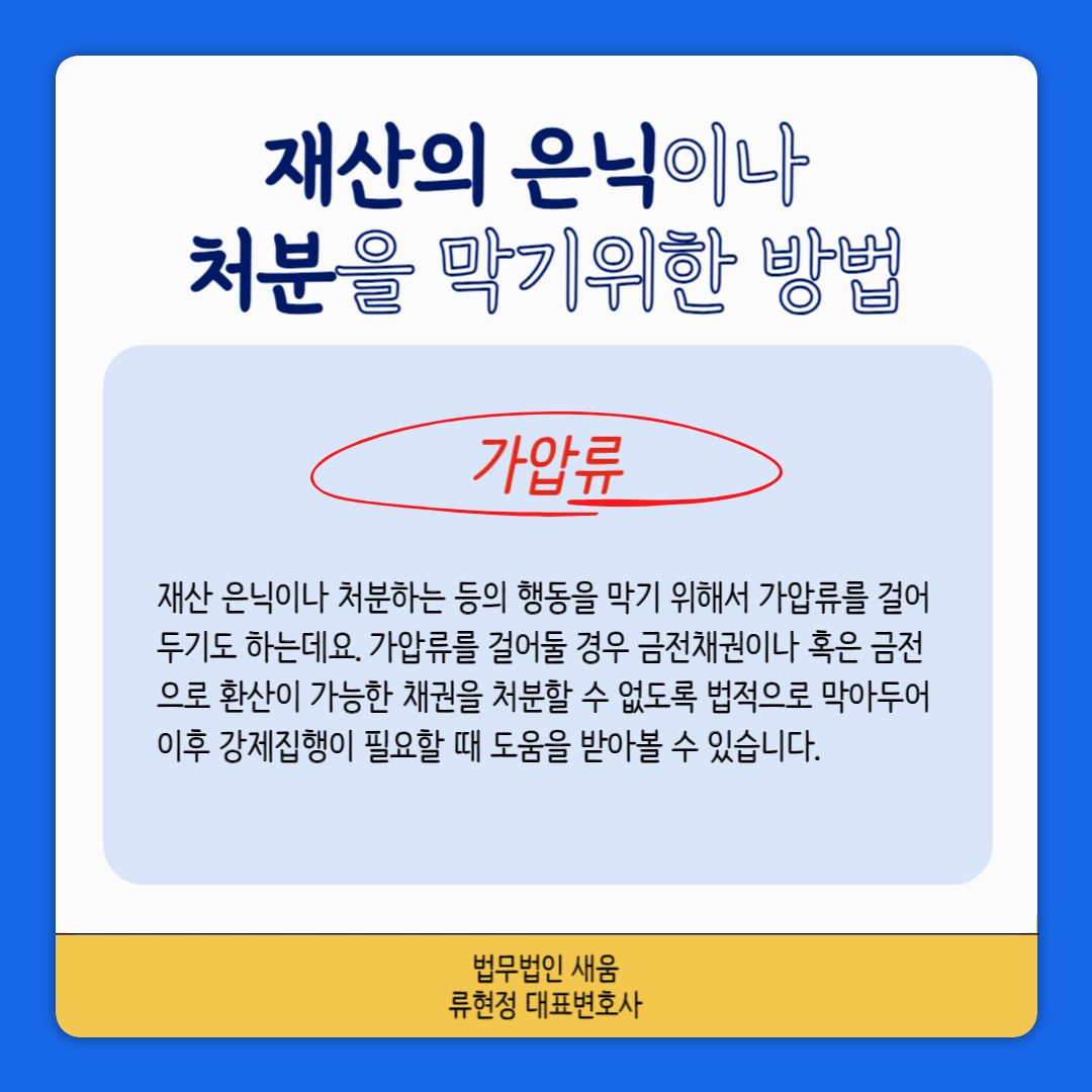 상대 배우자가 이혼시 재산분할 청구권을 행사하는 경우 본인의 자산이 줄어들게 될 것을 우려하여 몰래 숨기고 은닉하는 경우가 있습니다. 특히 경제권을 갖고 있으며 재산관리를 해온 경우 상대방이 재산상황에 대해서 명확하게 알지 못한다는 점을 이용해 이와 같은 행동을 하게 될 수 있는데요. 이렇게 되는 경우 기여도가 아무리 높아도 많은 재산을 분할 받는 것이 어렵습니다. 따라서 몰래 은닉하는 등의 행동을 막기 위해서 가압류를 걸어두기도 하는데요. 가압류를 걸어둘 경우 금전채권이나 혹은 금전으로 환산이 가능한 채권을 처분할 수 없도록 법적으로 막아두어 이후 강제집행이 필요할 때 도움을 받아볼 수 있습니다.