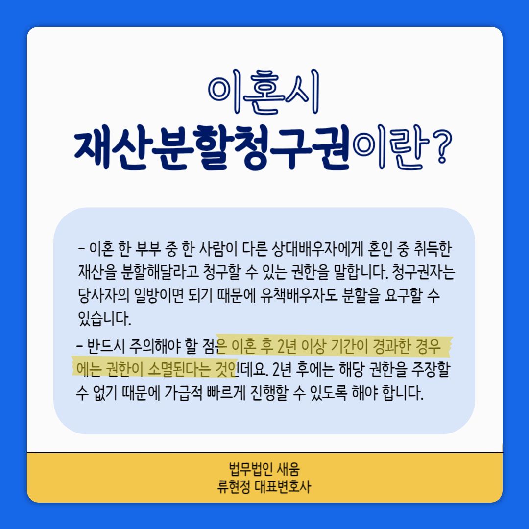 이혼시 재산분할 시 반드시 주의해야 할 점은 이혼 후 2년 이상 기간이 경과한 경우에는 권한이 소멸된다는 것인데요. 2년 후에는 해당 권한을 주장할 수 없기 때문에 가급적 빠르게 진행할 수 있도록 해야 합니다.