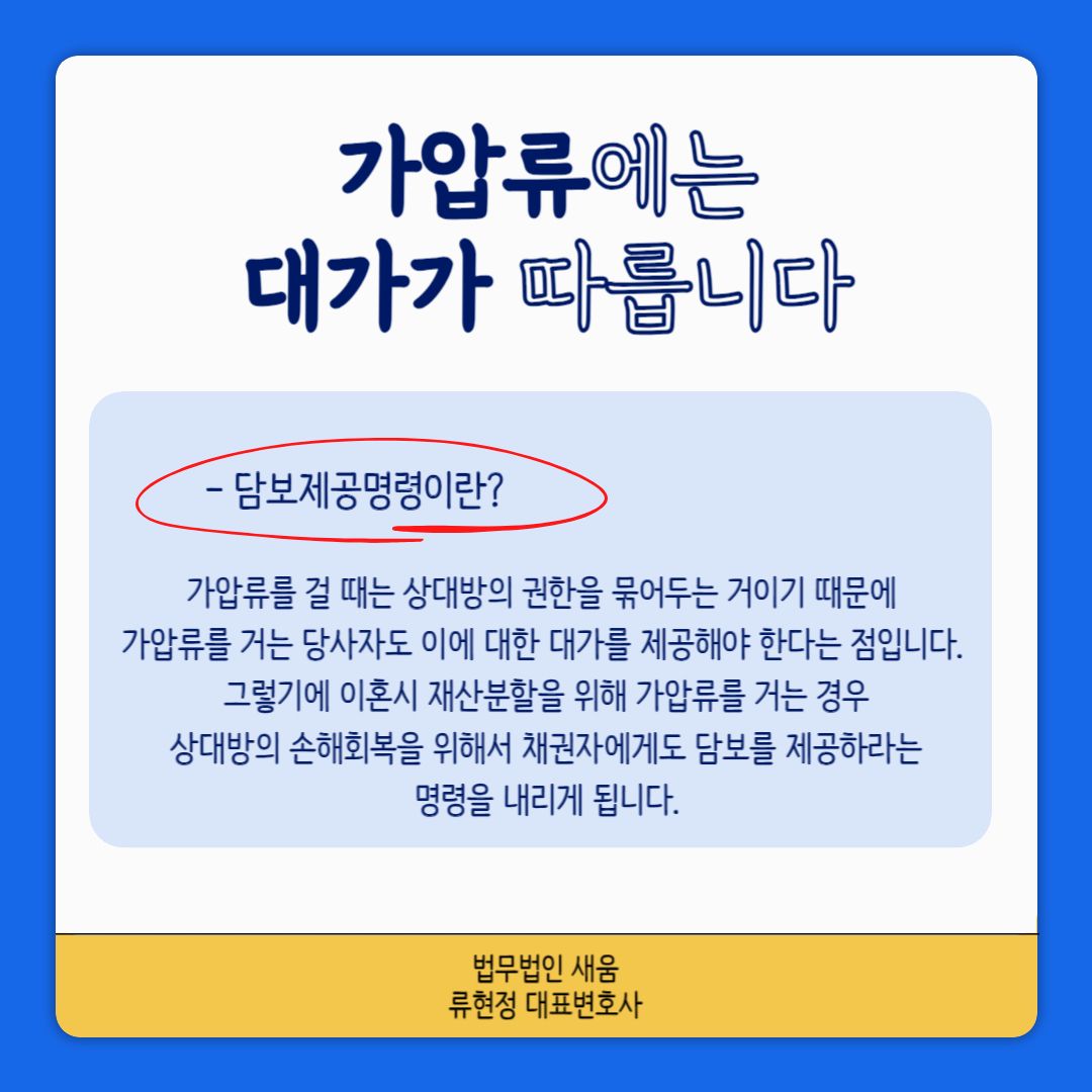 가압류를 걸어둘 경우 상대방이 재산을 처분할 수 없도록 보존할 수 있으며 이를 통해 정당하게 분할을 받아볼 수 있게 되는데요. 여기서 문제는 가압류를 걸 때는 상대방의 권한을 묶어두는 거이기 때문에 가압류를 거는 당사자도 이에 대한 대가를 제공해야 한다는 점입니다. 그렇기에 이혼시 재산분할을 위해 가압류를 거는 경우 상대방의 손해회복을 위해서 채권자에게도 담보를 제공하라는 명령을 내리게 됩니다. 담보제공명령이 내려오게 되면 보통 현금공탁을 진행하게 되는데요. 대부분 이혼소송이 진행되는 경우 가압류를 걸 때는 보증보험증권으로 대체가 되기 때문에 담보제공명령까지 내려오는 일이 많지는 않으나, 아예 일어나지 않는 일은 아닙니다. 하지만 혹시라도 현금공탁을 해야 하는 일이 발생한다면 담보제공명령이 취소될 수 있도록 별도의 법적 조치를 취해야 합니다.
