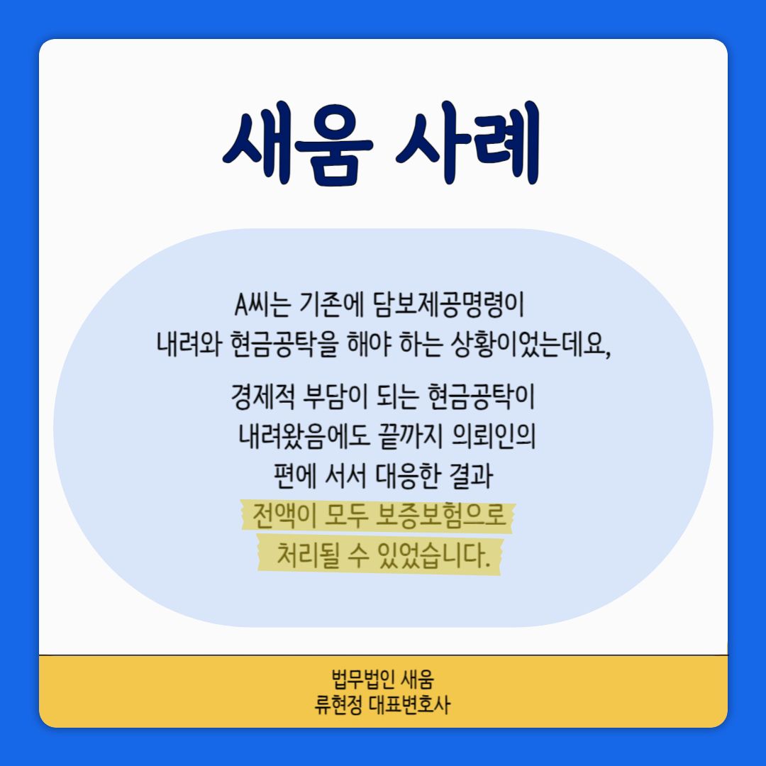 법무법인 새움을 찾아오신 의뢰인 A씨도 이와 같은 문제로 도움을 요청하셨습니다. A씨는 배우자의 외도로 인해서 이혼을 하는 과정에서 문제가 생겨 찾아오게 되었습니다. A씨는 기존에 담보제공명령이 내려와 현금공탁을 해야 하는 상황이었는데요. 이에 본 사무소에서는 현금공탁이 현재 A씨에게 부담이 되는 사정에 대해서 설명했고, 이에 기존의 담보제공명령이 취소될 수 있도록 유도하였으며, 그 결과 전액이 모두 보증보험으로 처리가 되었습니다. 이렇게 경제적 부담이 되는 현금공탁이 내려왔음에도 끝까지 의뢰인의 편에 서서 대응한 결과 전액이 모두 보증보험으로 처리될 수 있었습니다.