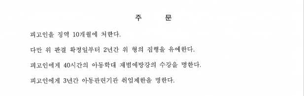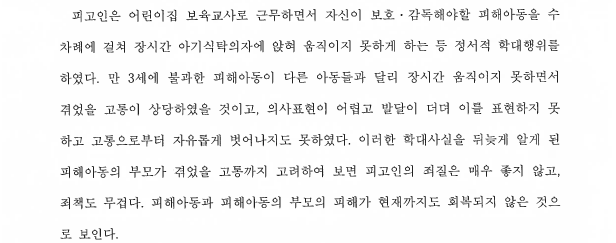 본 사안은 어린이집 보육교사가 만 3세의 아동을 부스터(아기의자)에 장시간 앉게 하는 등의 아동학대를 한 사안입니다. 피해아동은 총 24회에 걸쳐 학대를 당했고, 저는 피해아동의 부모를 대리하여 고소를 진행했습니다. 판결을 통해 보육교사에 대해서는 처벌이 내려지고 3년간 취업제한명령이 내려졌습니다.