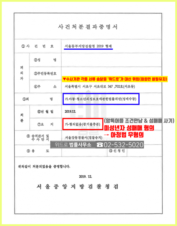 김경환 성범죄전담 검사출신변호사가 사건초기부터 직접 상담하고 경찰조사 동행 및 수사단계를 밀착조력하여 검찰의 아청법 무혐의 처분을 이끌어낸 사건.