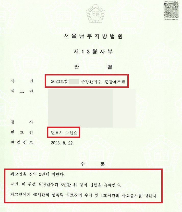 공판과정에서 재판부는 피고인의 행동을 매우 부정적으로 보는 인상을 주었습니다. 그럼에도 법률사무소 로진은 최선을 다하였고, 재판부는 피고인의 반성하는 태도와 변호인의 양형사유를 모두 종합하여 결국에는 집행유예의 선처를 해주었습니다. 만약 성범죄로 절망적인 상황에 있다면, 주저하지 말고 법률사무소 로진을 찾아주시기 바랍니다. 최선을 다해 변론해드리겠습니다.