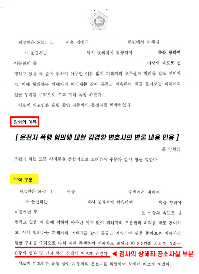 김경환 교통범죄전담 검사출신변호사가 수사단계부터 재판까지 철저히 조력하여 '상해'로는 무죄 선고를 받았고, 운전자폭행으로 '벌금형'의 유리한 선처를 받으면서 사건 종결 및 회사에서 당연퇴직도 면한 사례입니다.