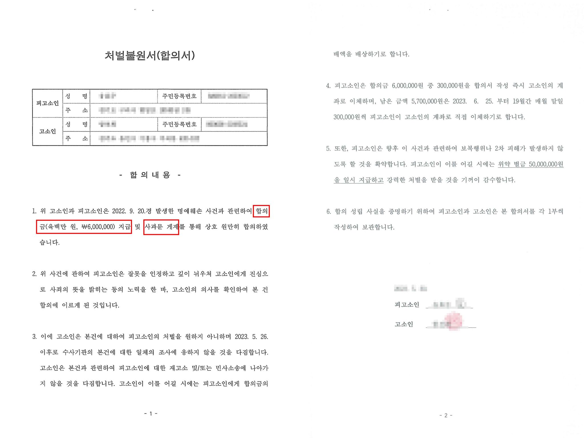 의뢰인의 요청에 따라 변호인은 각 합의서 작성 과정에 대해 차질없이 조속히 처리하였습니다. 이후 합의금을 받음과 동시에 가해자의 사과문 게시로 의뢰인의 명예를 회복하실 수 있었습니다.