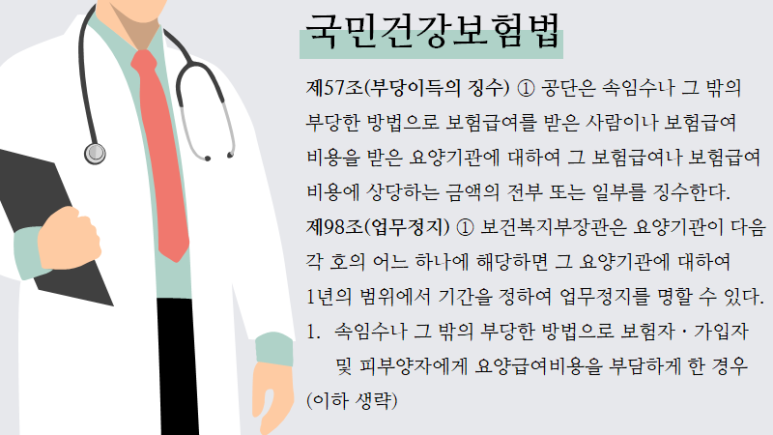 국민건강보험법은 ‘속임수나 그 밖의 부당한 방법’ 등 부당한 방법으로 보험급여를 받은 사람이나 보험급여 비용을 받은 요양기관에 대해 부당이득징수와 업무정지처분을 할 수 있는 근거를 마련해 두고 있습니다.