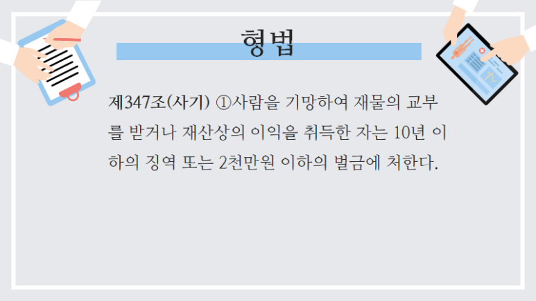 그런데 형법상 사기죄는 ‘사람을 기망하여 재물의 교부를 받거나 재산상 이익을 취득’했을 때 성립하고, 실무에서 기망행위(재산상의 거래 관계에서 서로 지켜야 할 신의와 성실의 의무를 저버리는 모든 적극적 또는 소극적 행위)가 있었는지, 그리고 사기의 고의가 있었는지가 주로 다퉈집니다.