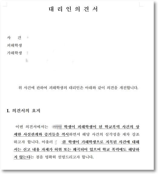 교내전담기구의 조사 과정에서 당사자들은 의견을 진술하는 것 외에 상대방의 진술을 반박하는 것은 할 수가 없습니다. 그리고 양 측이 합의 및 종결 의사가 없을 경우 사건은 학폭위로 심의 회부되는데요. 이제 이 단계에서 바로 변호사, 즉 대리인은 의견서를 내게 됩니다. 제가 쓰는 학폭위 의견서는 형사 재판에서 쓰는 변호인의견서나 변론요지서 급으로 매우 상세하고 전문적인데요. 각종 증거자료와 판례뿐만 아니라 비슷한 학폭 사건에 대한 기사나 논문, 지침들도 함께 첨부합니다. 특히 이 사건은 상대방 학생 두 명과 목격자로 나선 학생들 모두에 맞서 A군의 결백을 증명하고 피해사실을 입증하여야 했기에, 의견서가 매우 중요했습니다.