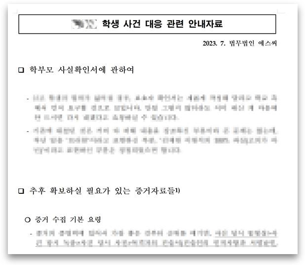 이 사건은 처음부터 형사고소와 학폭 신고를 병행하는 것으로 결정하고 시작하였습니다. 지난 1년간 A군이 당해온 것들을 보면, 폭행, 상해, 공동폭행, 모욕죄에 해당하는 내용들이 있었고, 이번에 일어난 사건은 공동감금, 공동체포, 강요, 협박 등에 해당하는 내용들이 있었기 때문입니다. 그래서 우선 대응안내 자료 작성 및 전달을 통해 학생과 부모님께 초기 증거수집에 힘써주실 것을 부탁드렸습니다.