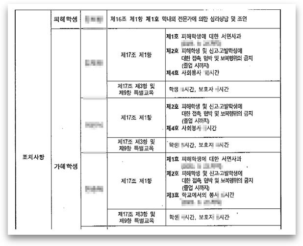 사실 물리적인 폭행이 없는, 상해진단서가 없는 사건에서는 4호까지 받아낸다는게 매우 어려운 일인데요. 이번 사건에서는 가장 주동자 격이었던 B, C학생에게 4호 처분과 다른 처분들이 병행되어 결정되었습니다.