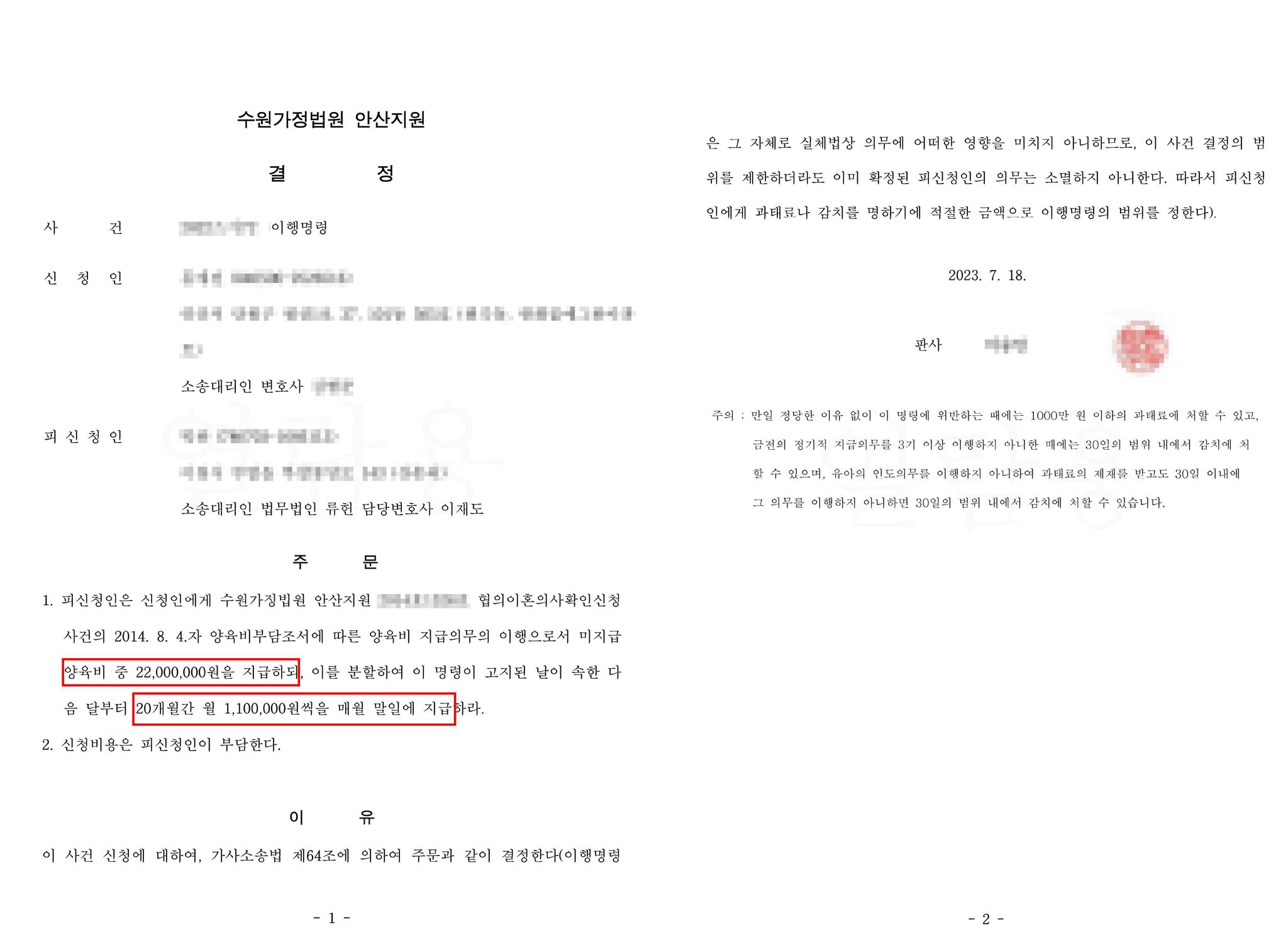 의뢰인은 상대방에게 2200만원을 지급회되 이를 20개월에 걸쳐 분할지급하는 이행명령을 받았습니다.