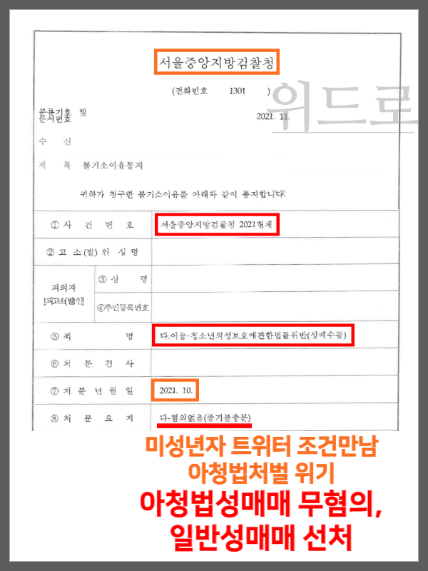 한 달 후에 경찰서에서 상대방이 미성년자이니‘아청법위반 미성년자성매매로 조사를 하겠다’라며 소환통보를 받음.