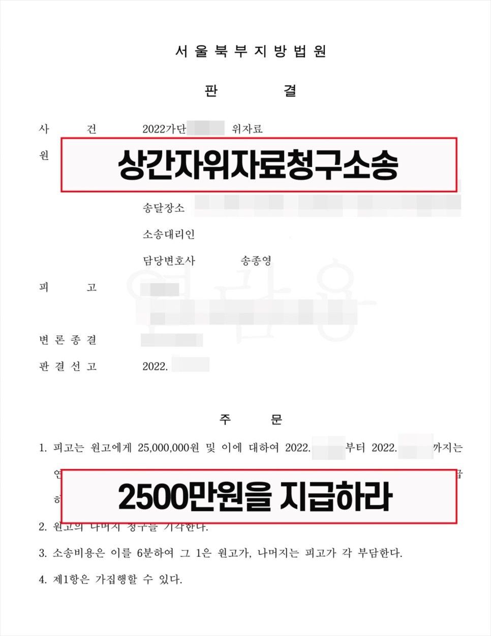 결국 재판부는 의뢰인이 입은 정신적 피해가 상당하다는 점을 인정해 상간남으로부터 위자료 2500만원을 지급하라는 판결을 내렸는데요.