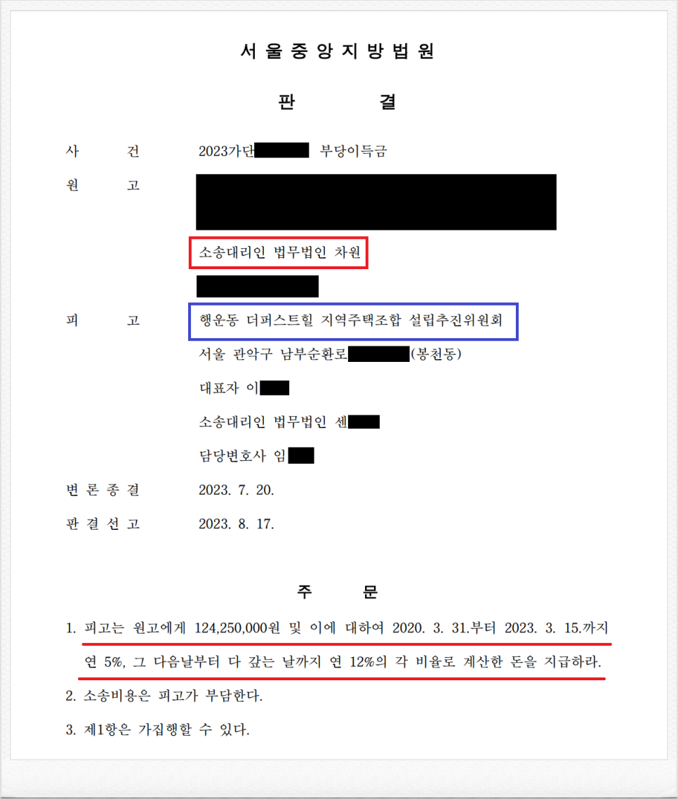 결국, 재판부는 이러한 저의 주장을 받아들였고, 피고는 의뢰인에게 124,250,000원 및 이에 대한 지연손해금을 지급하라는 내용의 판결을 이끌어 내었습니다.