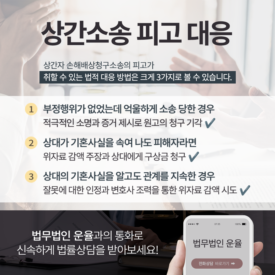 때문에 상간자소송에서 피고의 입장에서는 상대방의 결혼사실을 몰라 억울한 상황에 처했다고 하더라도 이를 반박할 수 없다면 법적인 책임을 피할 수 없습니다. 원고측에서 준비한 증거나 자료를 반박할 수 있도록 대비를 하는 것이 필요하기 때문에 가급적이면 상간소송변호사의 도움을 받는 것이 좋습니다.
