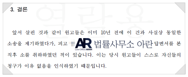 소 취하 후 10년만에 다시 소송을 당해 다시금 방어에 성공한 실제 사례를 소개해드리겠습니다.