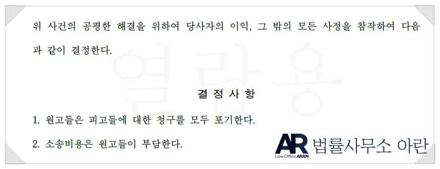 그 결과, 재판부는 원고들이 청구를 포기한다는 내용의 화해권고결정을 내렸고 이 결정은 그대로 확정되어 사건이 종결되었습니다.