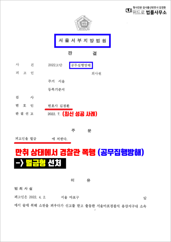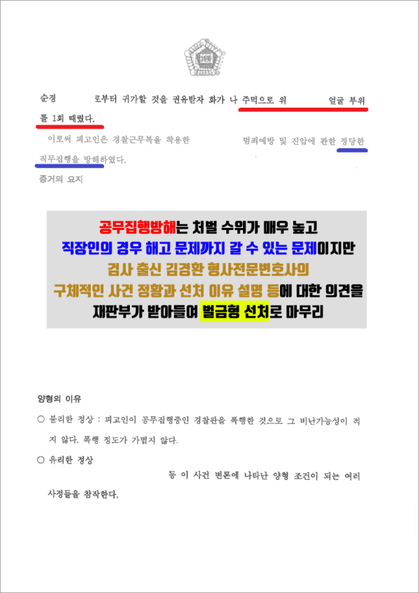 경찰관을 폭행하는 행위는 공무집행방해죄에 포함되어 처벌 수위가 굉장히 높고 선처도 쉽지 않습니다. 하지만 충분히 이를 유리하게 변호할 수 있는 조건들이 구축되어 있었고 결국 위드로 대표 변호인의 체계적인 대응으로 재판부에서는 모든 사정을 참작하여 벌금형 선고로 해고 문제까지 이어지지 않는 선에서 사건을 종결할 수 있었고 피고인도 그 동안 심적으로 고생이 많았던 만큼 눈물을 보이면서 오늘 일을 계기로 더 열심히 살겠다고 하면서 다시 예전의 일상을 회복을 위해 나아갔습니다.