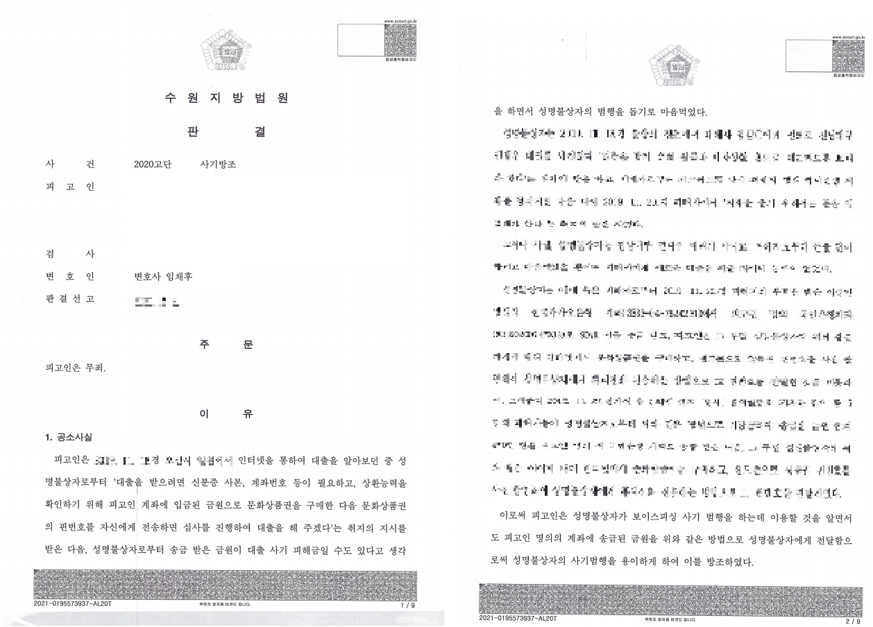 치열한 형사공판절차 끝에 의뢰인은 결국 보이스피싱 사기 범행의 방조라는 공소사실에 대하여 무죄를 선고받을 수 있었습니다.