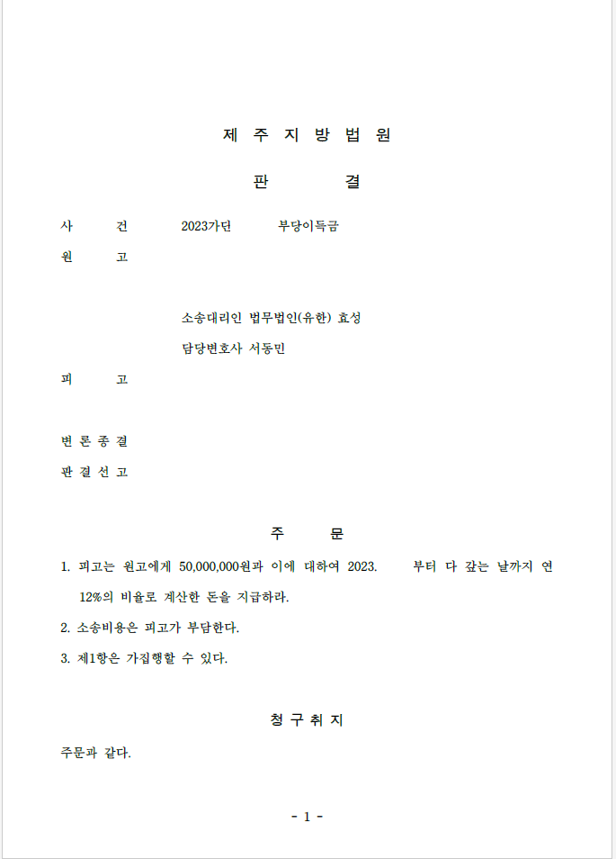 저는 즉각 입금 받은 자를 피고로 하여 민사소송 부당이득반환청구소송을 제기하였고 법원은 원고 승소 판결을 선고하여 의뢰인은 피해액을 반환받게 되었습니다.