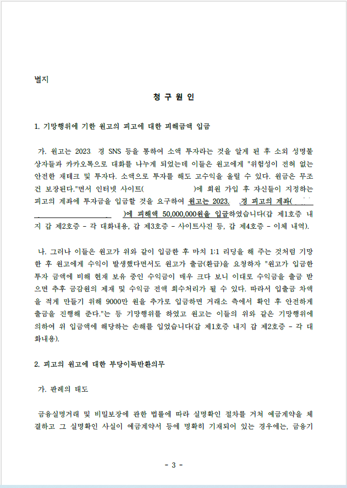 이 사건에서도 의뢰인은 투자 사기를 당하여 피고에게 피해액을 입금하였고 이를 돌려받기 위해 저를 찾아오셨습니다.