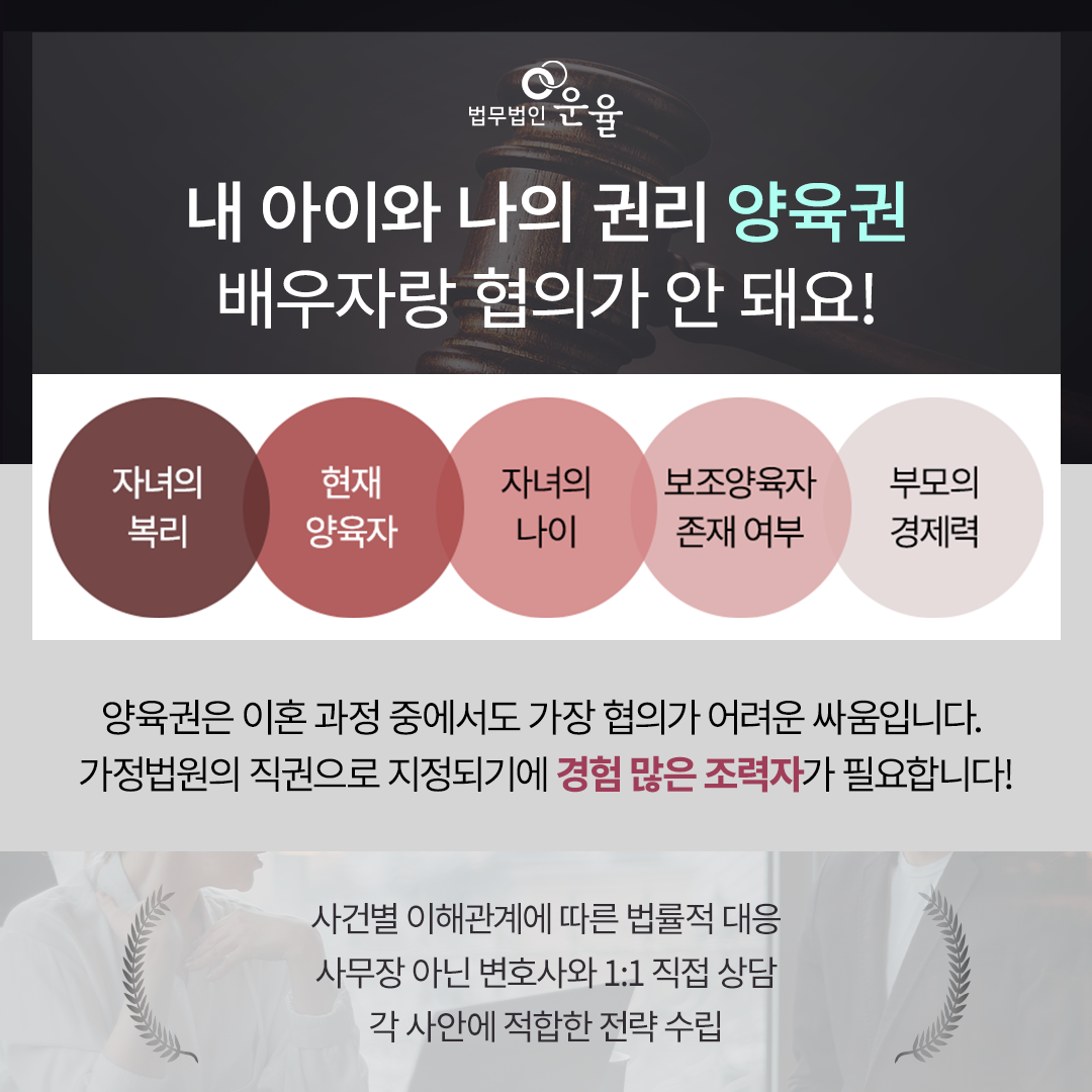 혼자서 이를 준비하고 양육권을 내 쪽으로 가지고 오는 것은 굉장히 어려운 일입니다. 그렇기 때문에 이혼상담변호사를 통해서 안정적인 결과를 이끌어내는 것이 중요합니다. 자문을 구해서 더 나은 결과를 초래할 수 있어야 되기 때문입니다.