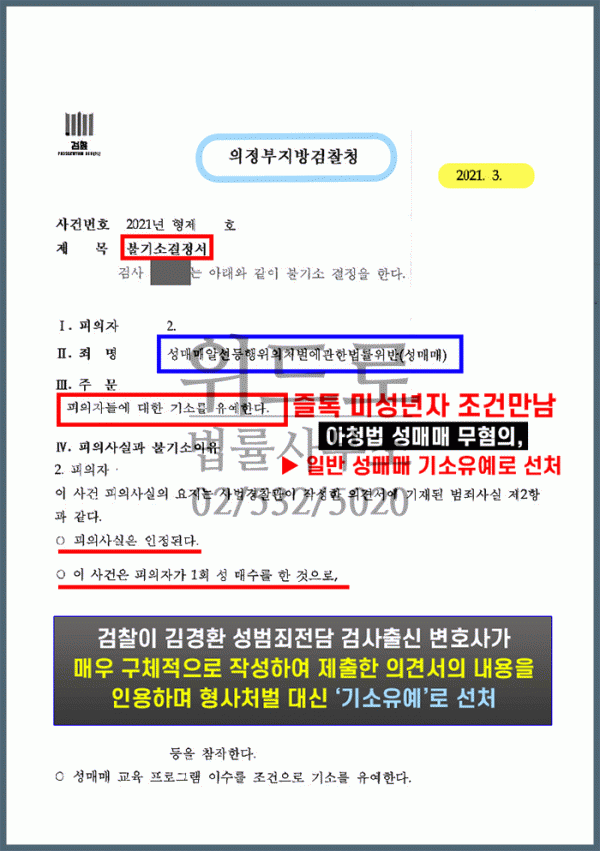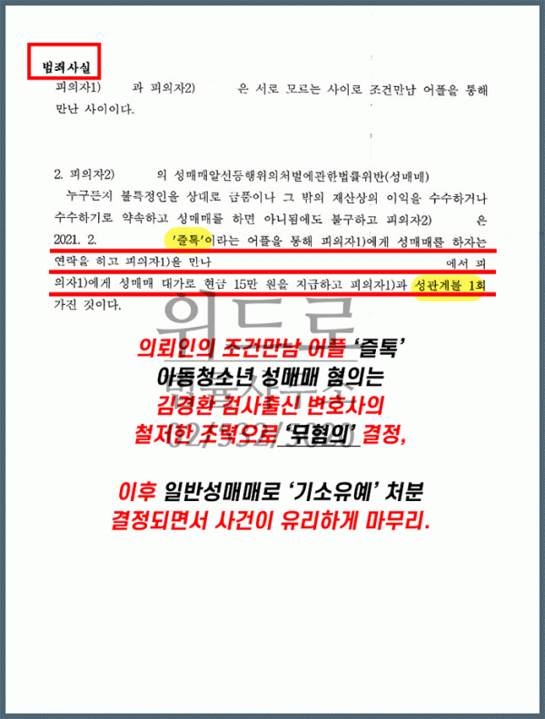 김경환 변호사가 직접 사건을 진행을 하면서 피의자 조사에 대비하여서 상세한 조사 시뮬레이션을 진행하였고, 경찰 조사에 동행하여서 피의자를 조력한 결과, 아청성매매에 대해서 무혐의 처분을 받게 되었음.