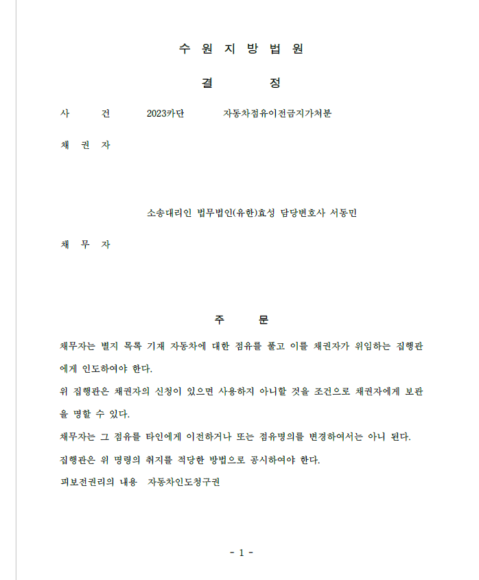 저는 즉각 자동차인도청구소송을 제기함과 동시에 자동차점유이전금지가처분을 하였고 가처분 인용 결정이 난 후 자동차를 회수하였습니다.