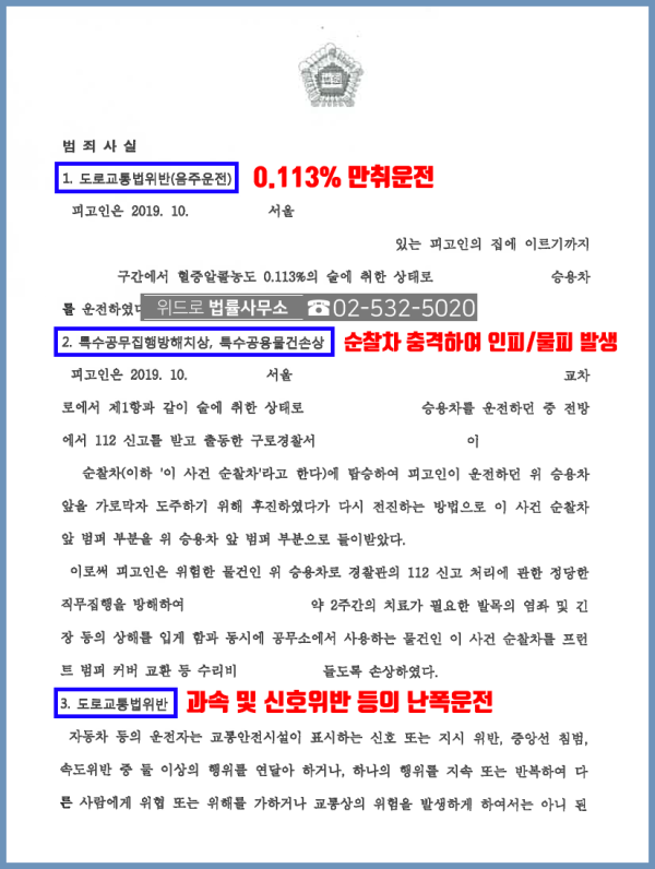 죄명 : 특수공무집행방해치상 / 특수공용물건손상 / 도로교통법위반(음주운전) 등