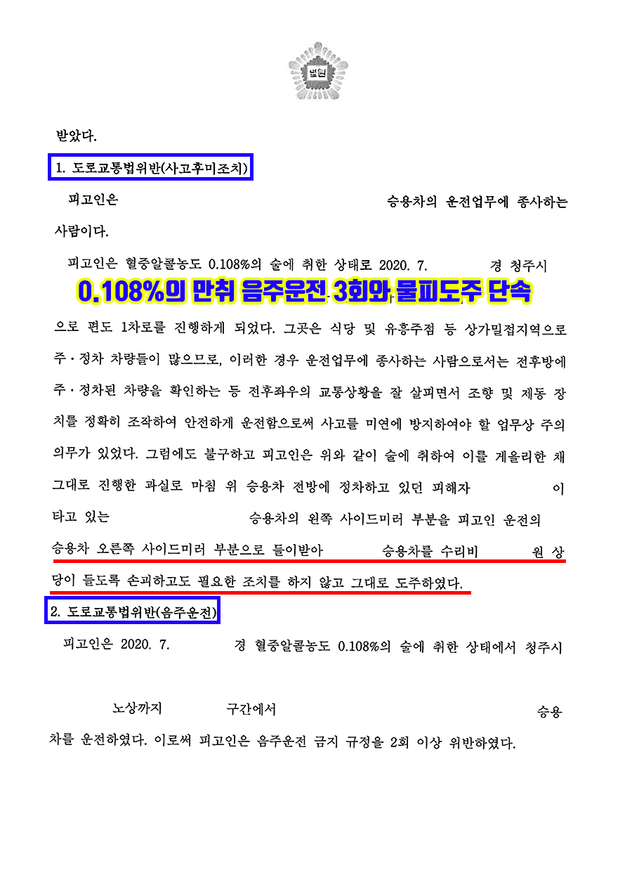 죄명 : 도주치상죄 / 도로교통법위반(음주운전, 사고후미조치) 등