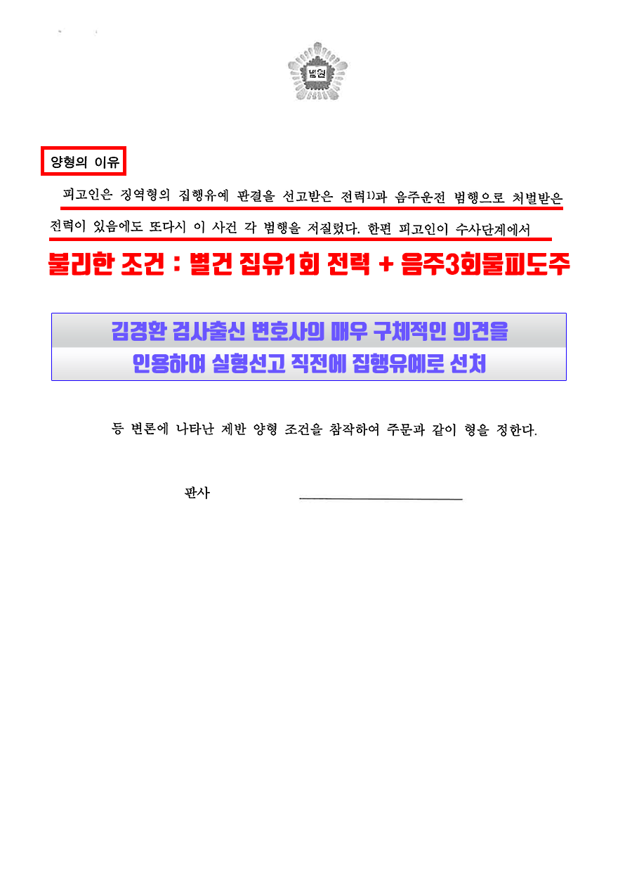 의뢰인은 별건으로 집유1회 전력과 이번에 음주3진 재범 + 뺑소니사고까지 일으켜 그야말로 실형위기인 상황에서, 김경환 변호사의 조력으로 인피뺑소니 무혐의 입증을 할 수 있었고, 음주운전3진과 물피도주만으로 재판을 받은 결과, 음주뺑소니 실형 대신에 또다시 집행유예라는 선처를 받을 수 있었던 사건입니다.