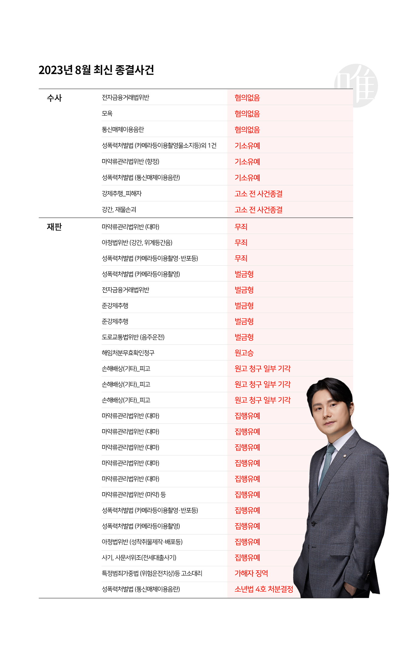 2023년 8월 최신 종결사건들의 결과 리스트입니다.