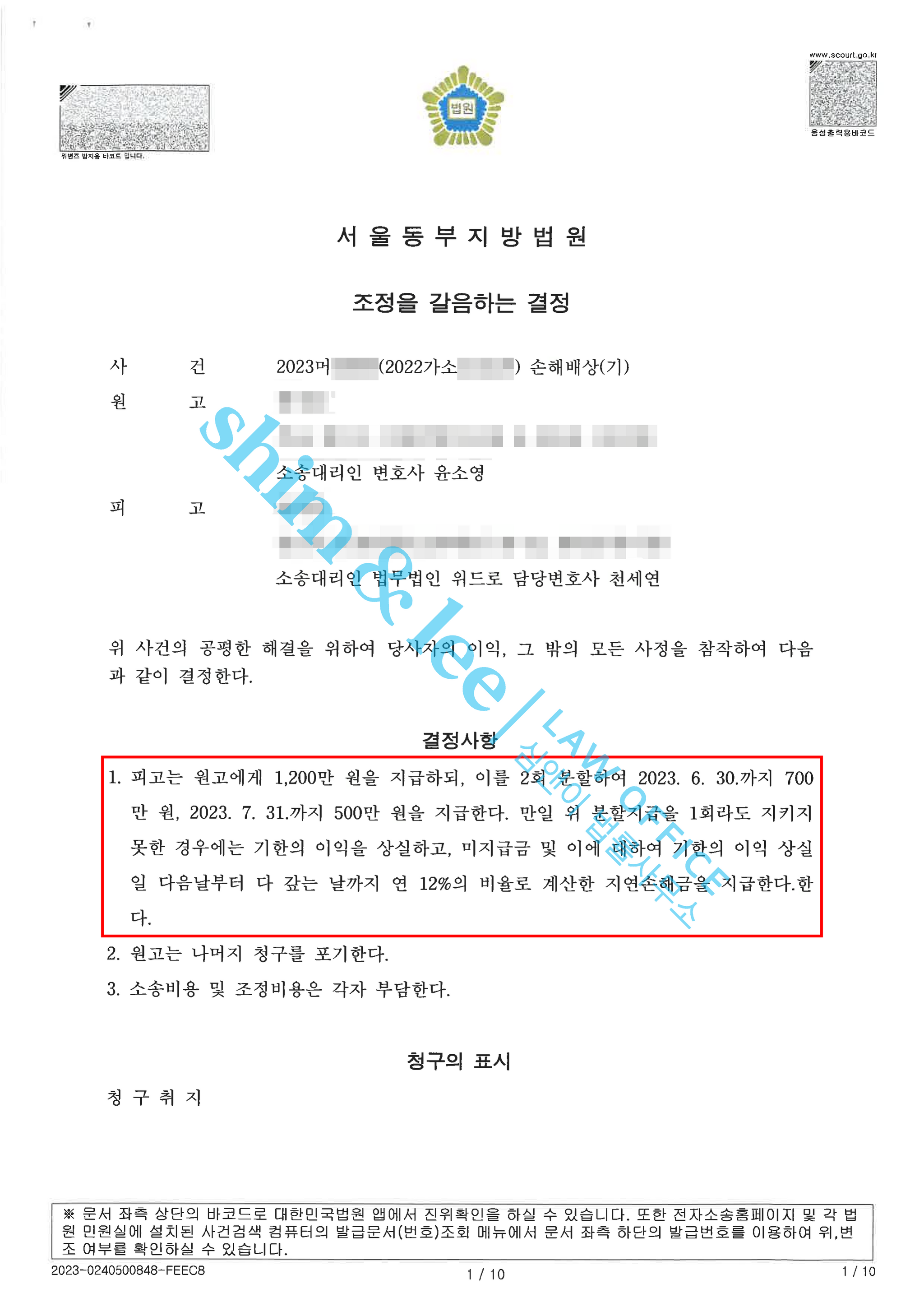결국 심앤이의 설득력 있는 주장에 판사님은 1,200만 원의 강제조정 결정을 내려주셨습니다.