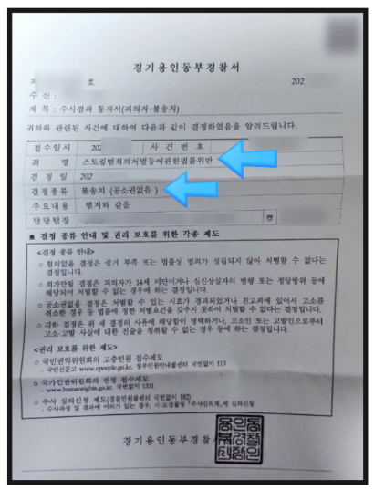 본 사건을 진행할 당시에는 스토킹처벌법에 반의사불벌죄 조항이 포함되어 있었기 때문인데요. 따라서 피해자와 빠르게 합의하기만 한다면, 경찰단계에서 공소권 없음으로 사건인 종결될 확률이 높았습니다.