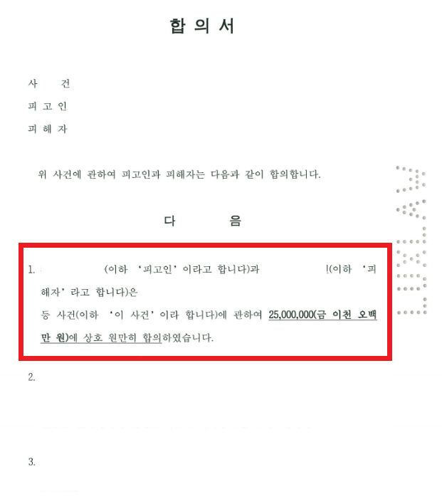 특히 요새 가해자들이 피해자가 제시하는 금액이 지나치게 과중하다며, 합의가 되지 않는 경우 형사 공탁을 걸면 그만이라는 식의 태도를 많이 보이고 있는데요, 이 사안 역시 가해자측에서 형사 공탁을 언급하며 합의금으로 500만원을 제안하였으나 5배 이상 합의금을 증액시켰던 사안입니다.