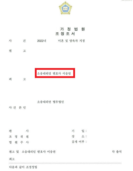 저의 강력한 주장 및 설득으로 조정 위원님들 역시 남편측을 설득하기 시작했고, 오랜 시간 조정을 진행한 끝에 결국 저희 의뢰인이 친권, 양육권을 확보하게 되었습니다.